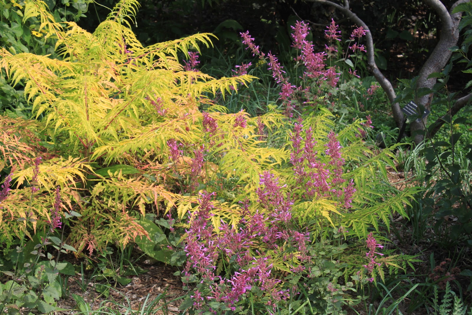 I loved this combination of Rhus typhina 'Tiger Eyes' and Agastache 'Bolero'. 'Tiger Eyes' will spread and take up lots of room eventually, but the color and texture of it is amazing. 'Bolero' makes a great filler plant since its a very airy variety and doesn't take up a lot of real estate. It looks to be doing quite well in Green Bay, definitely a zone 5 hardy variety. As with all Agastache, good drainage is a must.