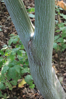 GBBG has a fairly good sized specimen of one of my favorite trees, striped maple Acer pennsylvanicum. Striped maple is a nice small tree to 30' tall x 25' wide and features beautiful green bark striped with white fissures. The three-lobed leaves are large, up to 8" long and wide and turn a beautiful yellow in the fall. It prefers partial shade and well-drained soils.